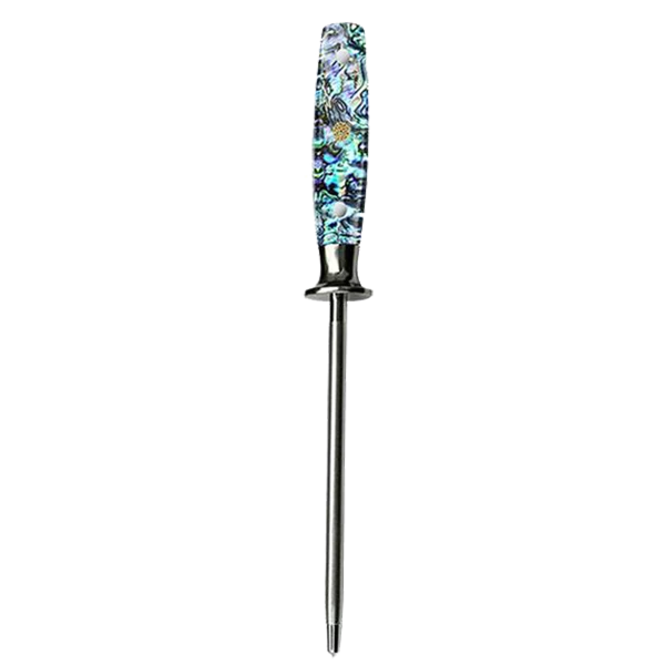 The handle on this Sharpening Steel are made on natural abalone cast in resin and fit to the knife. These handles are extremely stable. They are attached with 2 standard pins and one intricate mosaic pin. These Highly polished knives will look great in your kitchen.