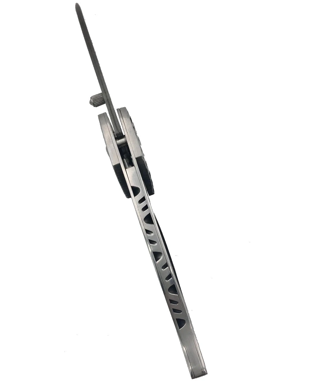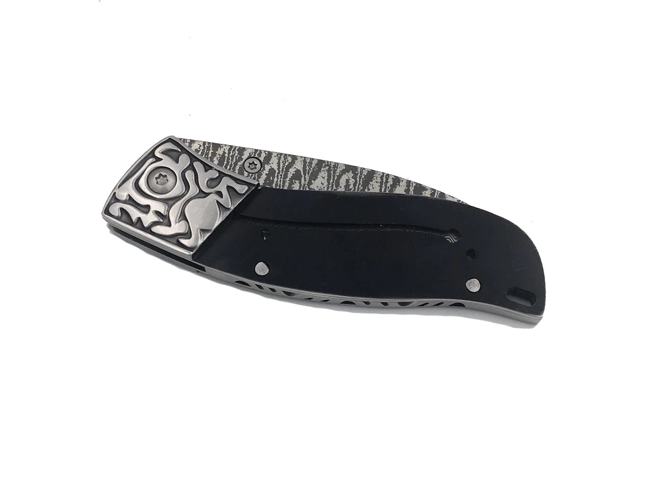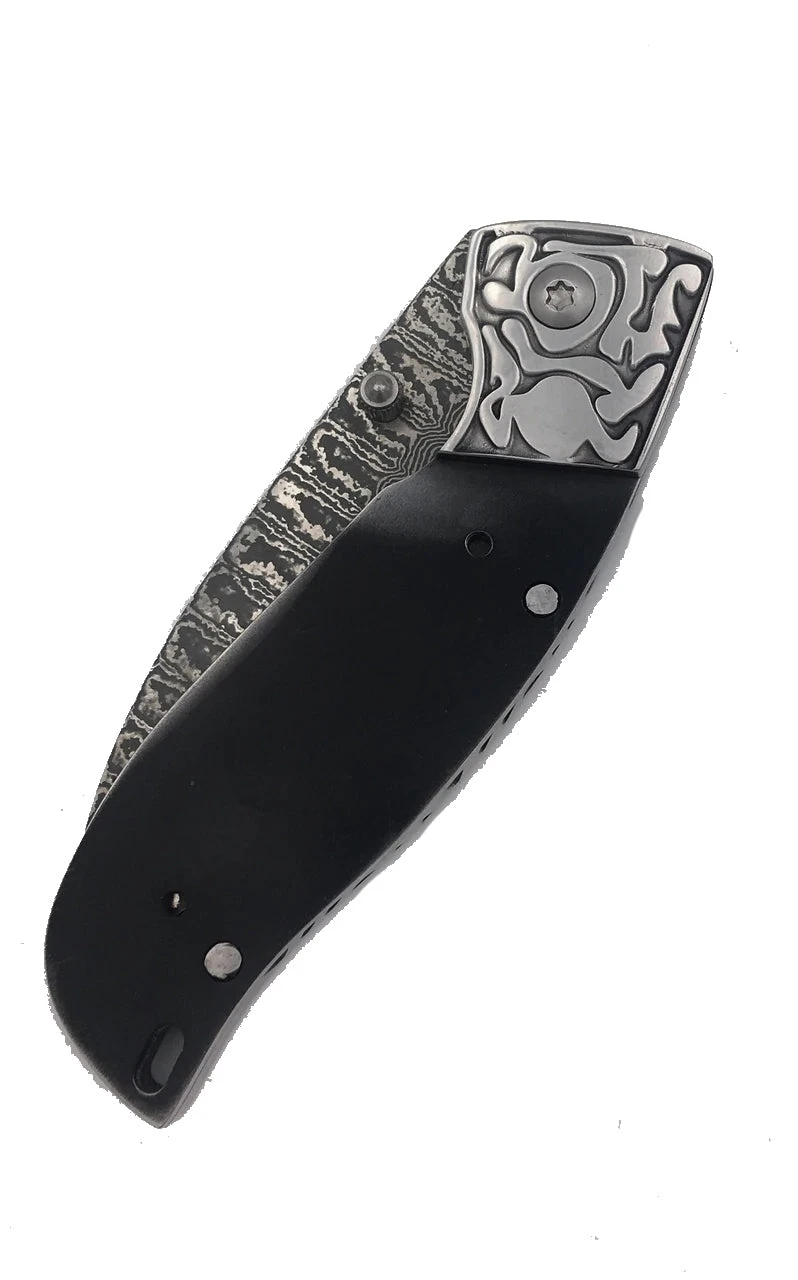 We attached stainless sculpted bolsters to accent the Damascus spine. Liner lock type mechanism. Attached thumb stud with file work on the spine and very sharp. Use rod or screws to fix handles.