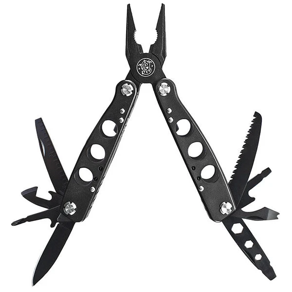 4 1/8″ closed. Black finish stainless components. Features spring loaded needle-nose pliers, wire cutters, blade, small Phillips screwdriver, can opener, ruler, fine grit file, hexagon wrench – 3 sizes, large and small screwdrivers, bottle opener, nail puller, and saw. Black finish stainless handles with machined hole cutouts. Black nylon belt sheath. Hang packaged.